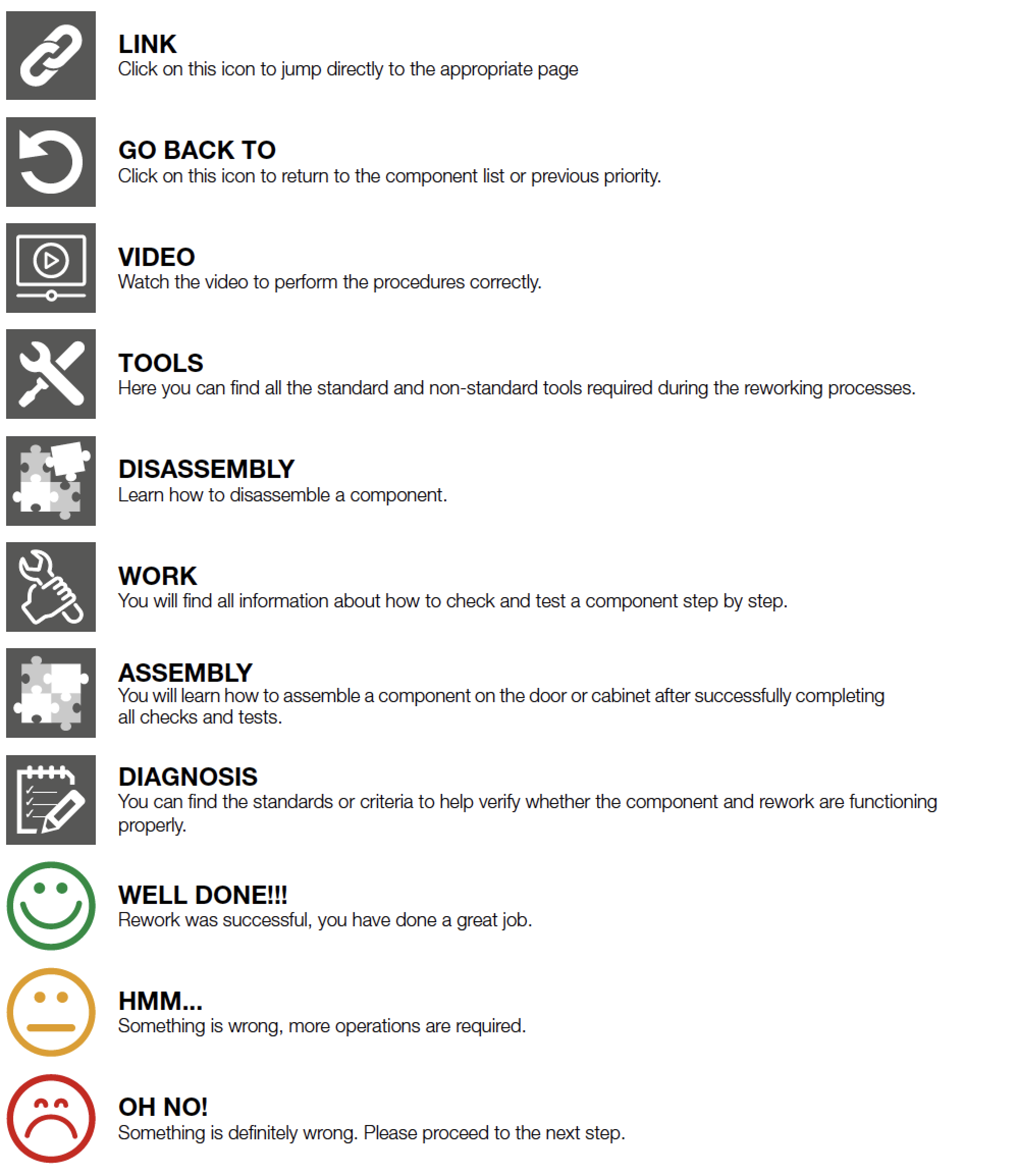We will be utilizing the following set of icons in all rework processes. Please read the descriptions of each icon carefully in order to fully understand its significance.